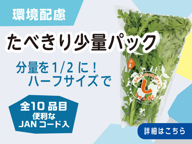 適量目の購入促進で食品ロス問題に対応 量販店などの青果売り場向け作物別少量目パッケージシリーズ【たべきり少量パック】をご紹介します。たべきり少量パックシリーズは、消費者が従来の量目では使い切れずに残っ ...