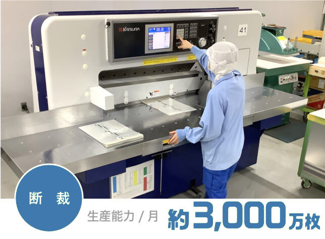 当社ではカットシートの製造にも対応しており、ワインダーを用いた積層柄合わせによって、一度に大量の製品を効率的に裁断することが可能です。