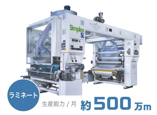 当社では、有機溶剤で溶解した接着剤を使用するソルベント(ドライラミネート)方式に加え、無溶剤で環境負荷の少ないノンソルベント方式のラミネート機も保有しています。