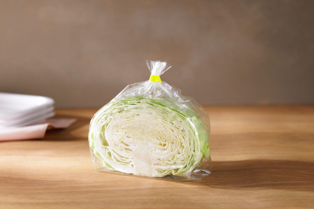 誰でも簡単にキャベツ1/2カットを包装できる、人手不足対策に適した包装資材です。