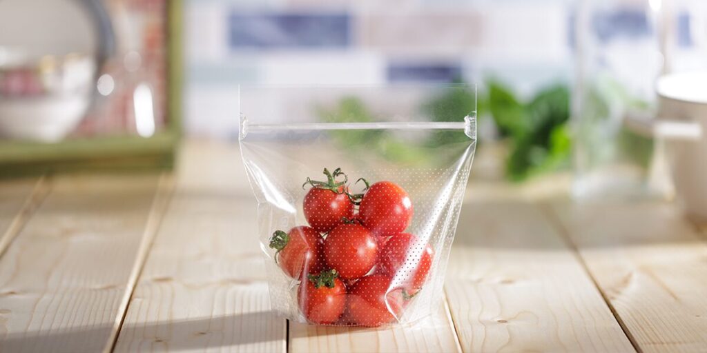 微細な穴を袋全体に配置することで、内容物の鮮度を長持ちさせる効果を持つチャック付きパッケージです。従来の容器包装と比較してプラスチック使用量を大幅に削減できるため、鮮度保持と環境配慮を同時に実現します。