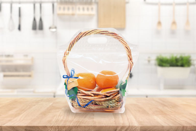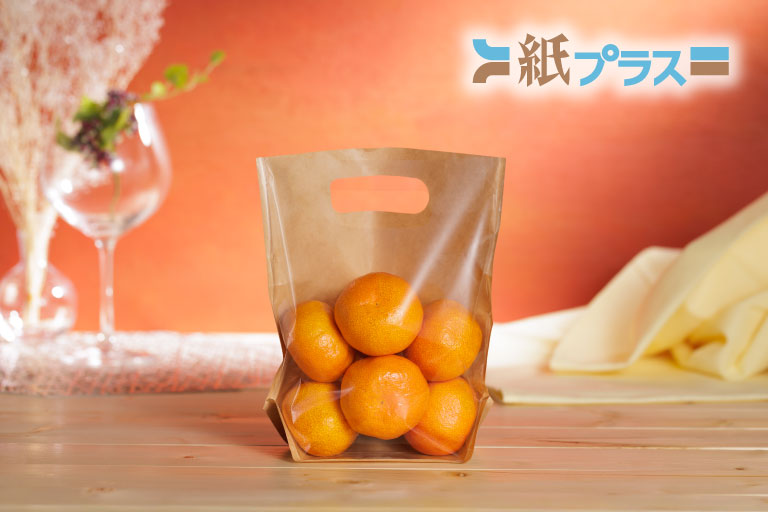 袋なのにかごのように見える意匠で、店頭やギフトシーンを華やかに演出できるスタンドパック。持ち手付きで扱いやすく、袋に入れるだけで手軽に華やかな演出が行えます。