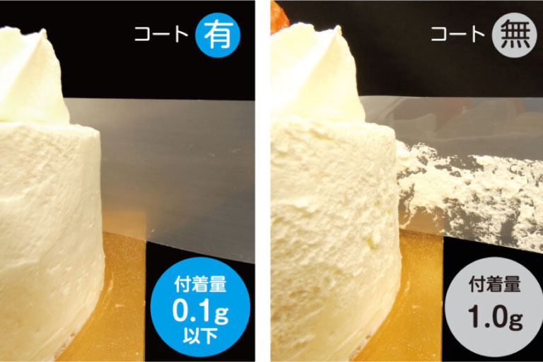 ナノコーティング技術でクリームをはじく「アクアグライド」。商品を美しく保ちながら素材ロスや手間を低減する食品包装向けコーティングフィルムです。