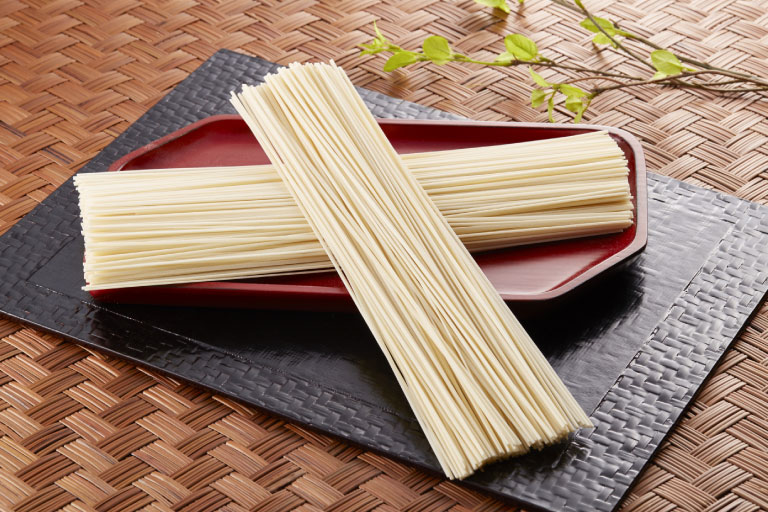 麺類や乾物向けの背貼り袋を、用途や内容量に合わせて別注で対応しています。無地仕様に加え、梨地フィルムを用いた高級感のある仕立てもご相談いただけます。