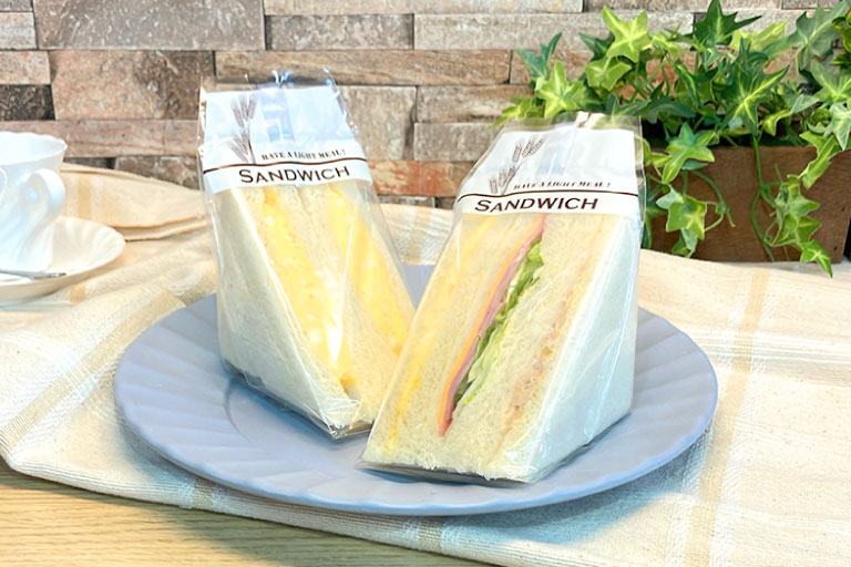 三角形状でサンドイッチを美しく見せる包装袋。サイズ展開に加え、別注やブロックシール加工にも対応し、ブランドや中身に合わせた袋作りにお使いいただけます。