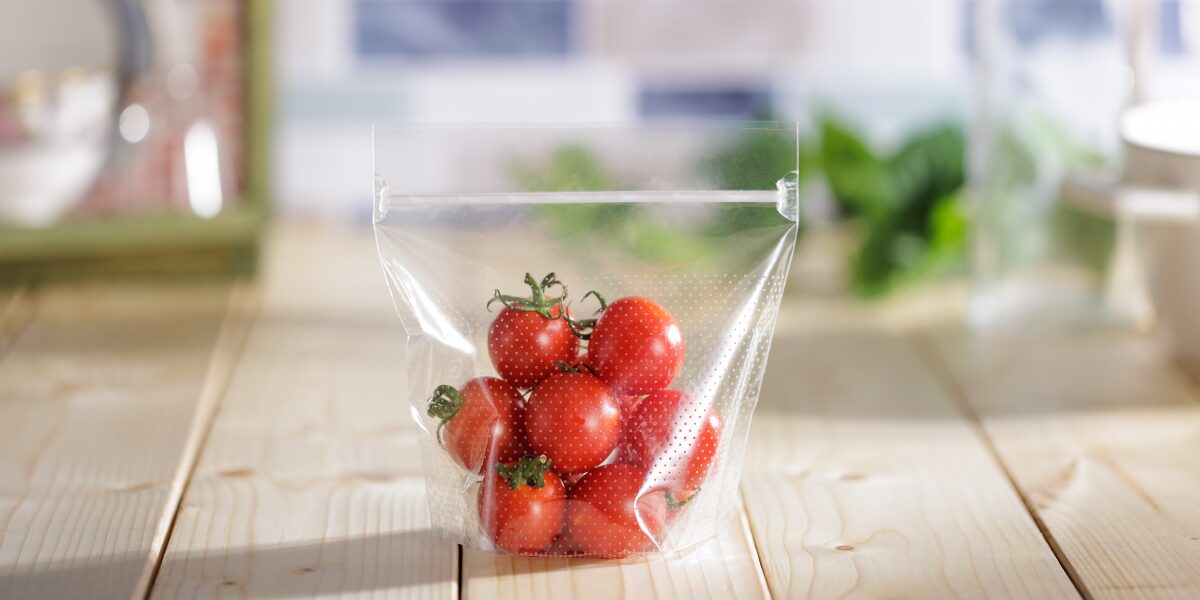 精工の「チャック付き有孔袋」は、パッケージの広範囲に空気が通る孔を設けることで、トマトのしなびを抑えながら、包装内の湿度上昇を抑制し、カビの発生を抑える効果が期待できます。