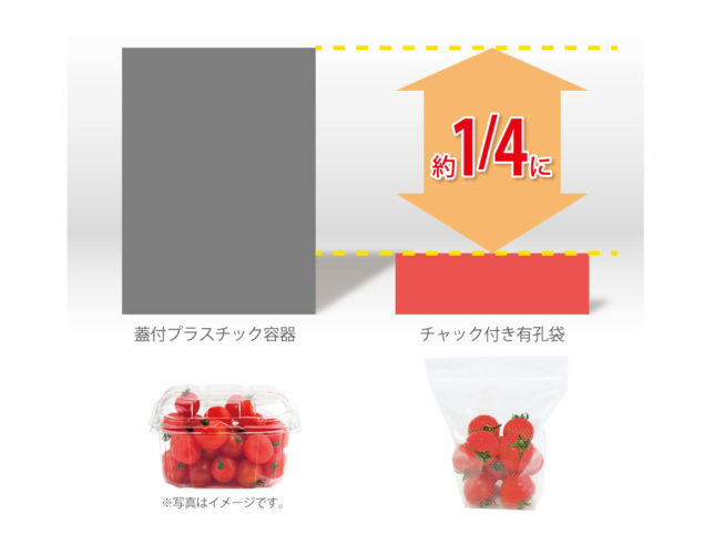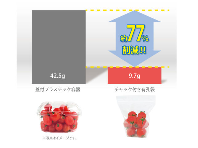 同じくミニトマト200g用パッケージにおいて、1枚当たりの重量を比較すると、「チャック付き有孔袋」は一般的な容器の約1/4の軽量化を実現しています(※2)。
