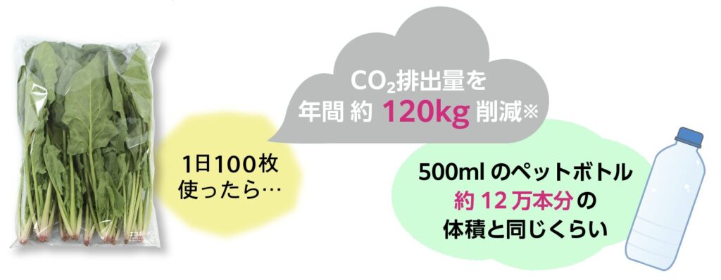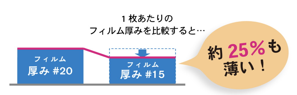 フィルムを薄くすることで、1枚あたりのプラスチック使用量を抑えることができます。たとえば、現在使用している20μmの袋から「エコボードン#15」に置き換えるだけで、約25%の減プラ効果が得られます。包装仕様や作業フローを大きく変えることなく、取り入れやすい点も特長です。