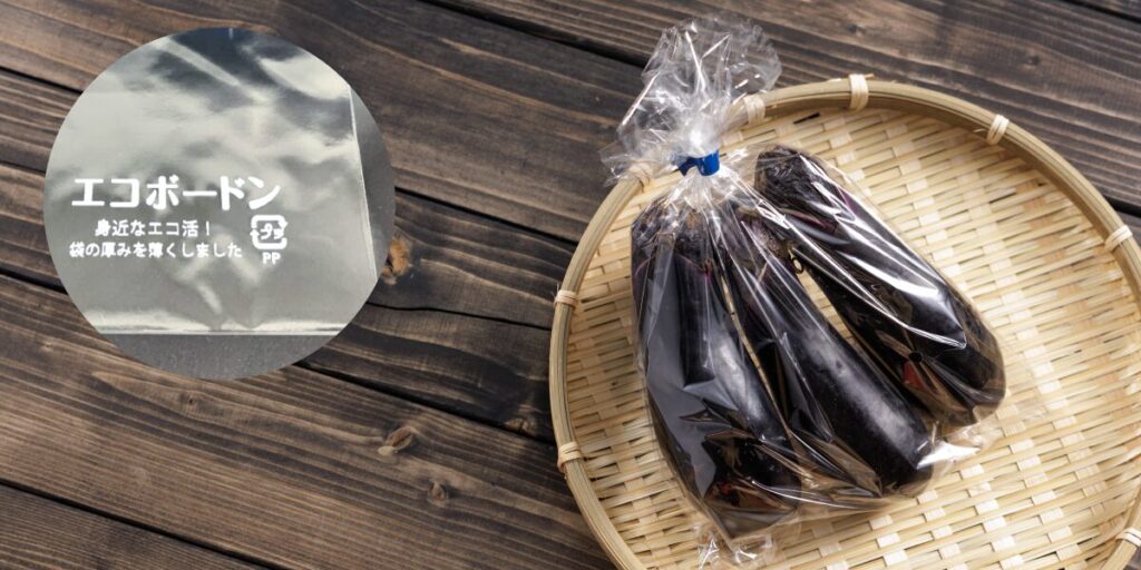 「エコボードン#15』はフィルム厚#15のOPP防曇フィルムです。袋には「身近なエコ活!袋の厚みを薄くしました」と袋の端に小さく印刷が入っています。減プラの取り組みを消費者にもPRできます。