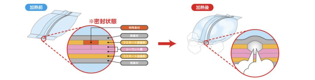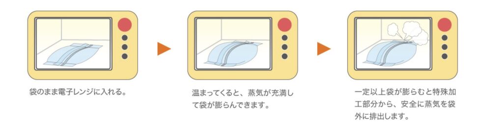 フィルムの内側に特殊なスリット加工を施してあり、レンジで加熱するまでは袋の密封性が保たれます。加熱中に一定以上膨らむと、そのスリット部分に小さな孔が開き、蒸し調理に必要な蒸気は袋の中に残したまま、過剰に出た蒸気だけが袋の外に排出される仕組みになっています。