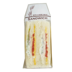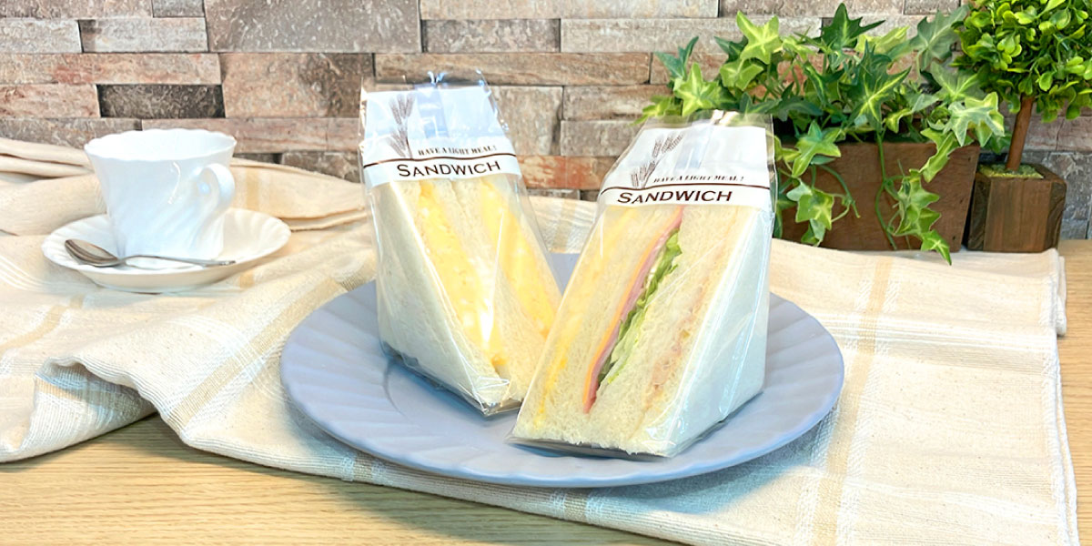 シンプルなデザインのサンドイッチ袋。サンドイッチの幅に合わせて選べる3サイズ。開きやすいテープ付きです。別注品も承ります。