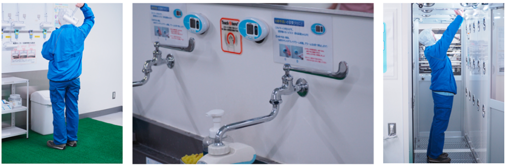- エアーシャワーで毛髪や埃を吹き飛ばし、異物混入を防止
