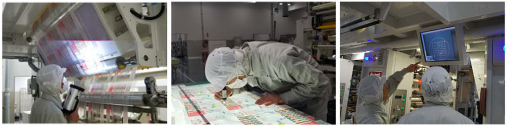 フィルムの異物付着・汚れ・印刷状態などを、欠点検査機と作業員の目視チェック の二重体制で確認。精度の高い検査を実施し、不良品の流出を防ぎます。
