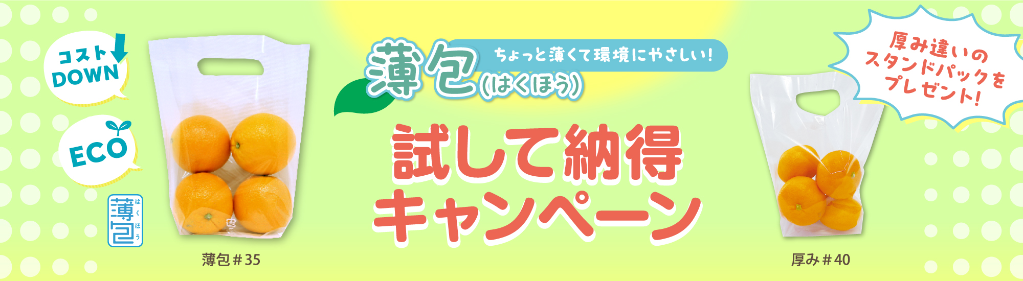・キャンペーンに応募いただいた方に『薄包(はくほう)』スタンドパックならびにフィルム厚40μmのスタンドパックのサンプルをセットで提供いたします。
