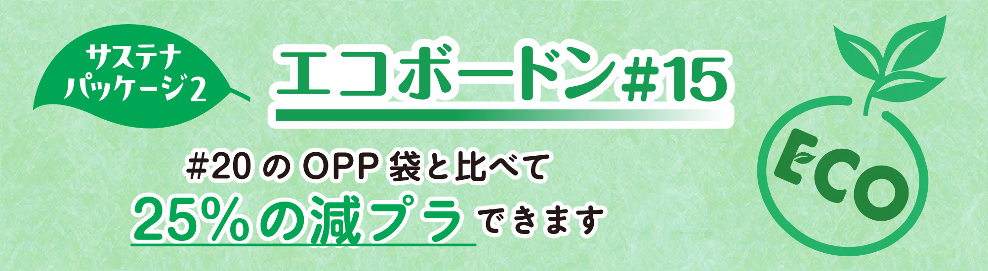 一般的な防曇袋(フィルム厚20μm)から15μmの「エコボードン#15」に切り替えることで、プラスチック使用量を効果的に削減します。現在お使いの20μmの袋から置き換えるだけで、環境への配慮が実現します。
