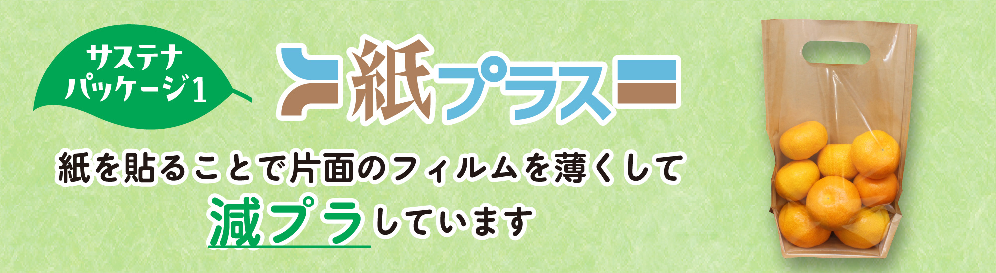 「紙プラス」は、クラフト紙とフィルムを貼り合わせた袋です。紙の面に使用しているフィルムは厚み15μmのため、プラスチック使用量を大幅に削減します。 例えば、写真のサイズで従来のOPPスタンドパック(フィルム厚40μm)と比較すると約36%の減プラ効果があります。